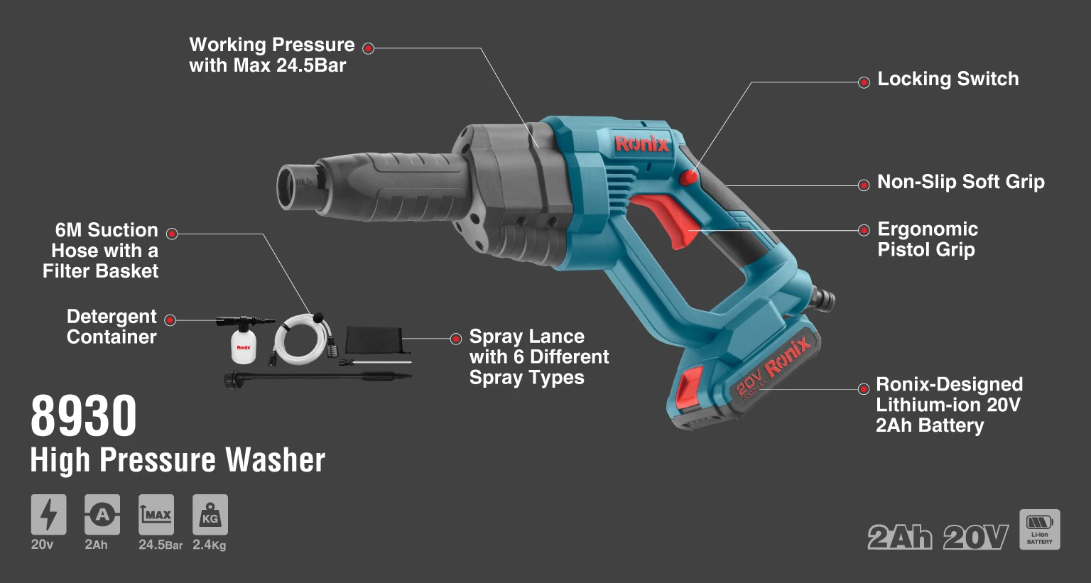کارواش 8930 رونیکس دارای قابلیت خودمکشی از مخزن آب بوده و قادر است آب را با قدرت مکش 4 متر و در مدتزمان 15 ثانیه به نقطه مورد نظر بپاشد. در این بخش، با ویژگیهای این کارواش شارژی پرکاربرد رونیکس با جزئیات بیشتری آشنا شوید.