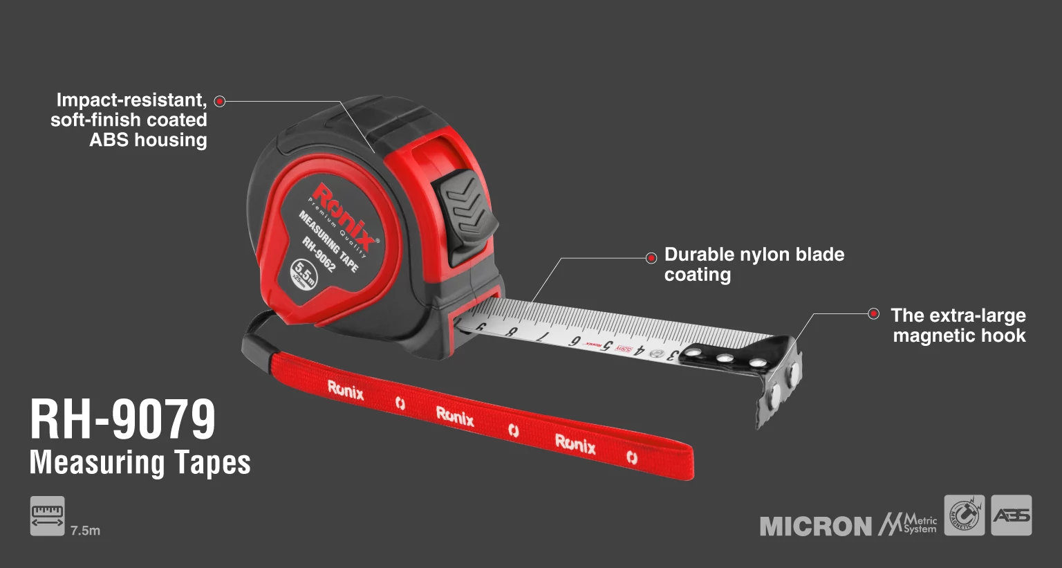 متر میکرون رونیکس مدل RH-9079 دارای تیغهای از جنس کربن استیل مقاوم و فنر مستحکمی است که با اعمال نیروی یکنواخت، کار را در استفادههای مداوم و طولانی آسانتر میکند. طول این تیغه معادل 7.5 متر و عرض آن 25 میلیمتر است. تیغه دارای خطوط اندازهگیری یکطرفه و واضح است تا خوانش اندازهها برای مصرفکننده آسانتر شود.