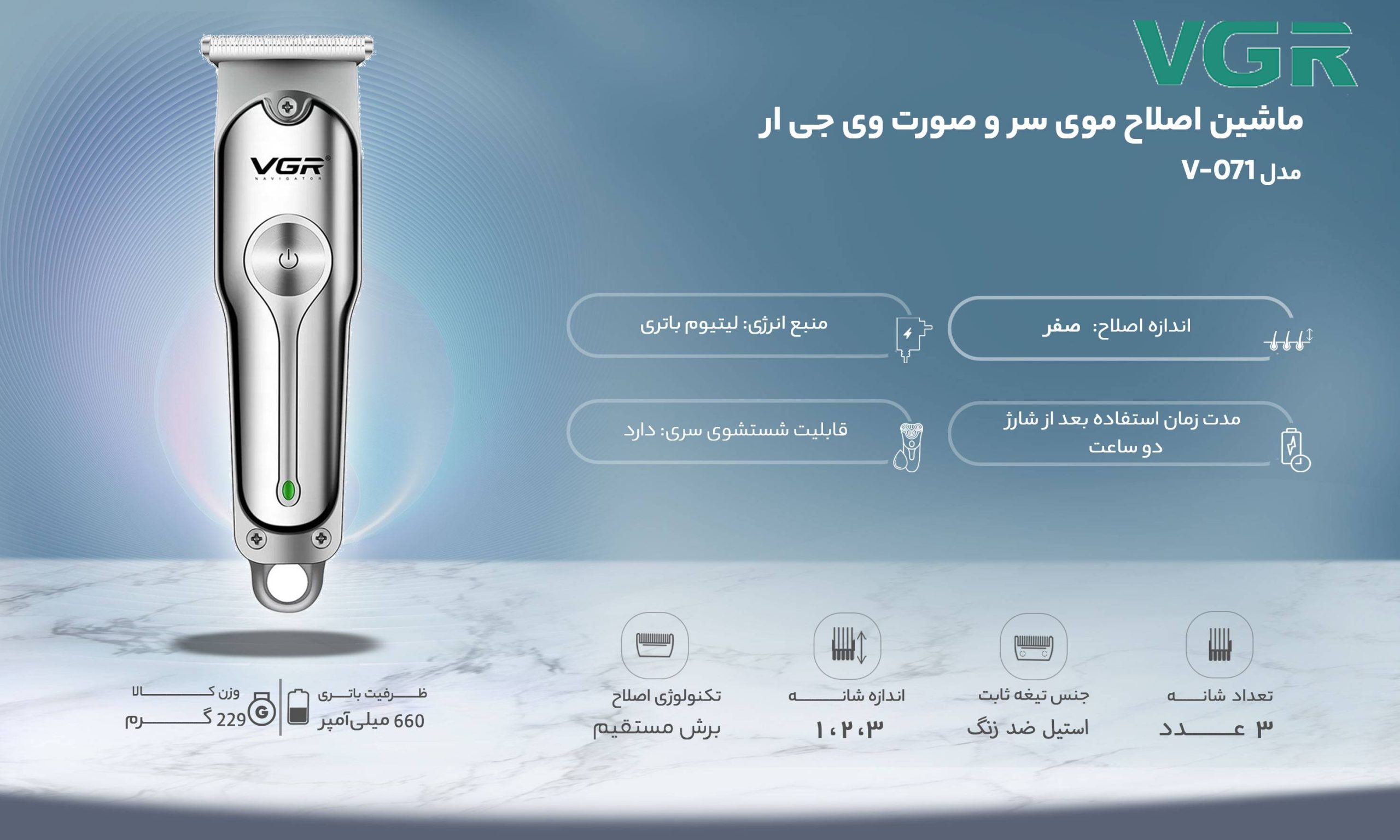 ماشین اصلاح موی سر و صورت وی جی ار مدل V-071 یک ماشین اصلاح بی سیم و قابل حمل است که می تواند برای اصلاح موهای سر و صورت به صورت خط زن، و حجم زن استفاده شود. این ماشین اصلاح دارای ویژگی های زیر است: