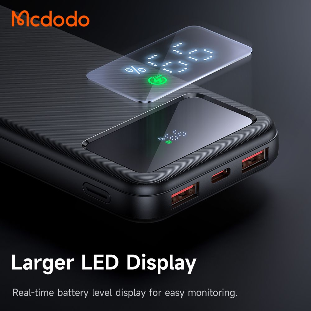 پاوربانک تایپ سی Mcdodo MC-4220 دارای ابعاد 16*68*146میلی متر و وزنی حدود 232گرم دارد که این ابعاد و وزن مناسبب باعث شده شما بتوانید به راحتی پاوربانک 10 هزار مک دودو را به هرجای منتقل کنید. در قسمت بالای این پاوربانک دو درگاه USB و یک درگاه Type-c قرار گرفته است. برای اطلاع از میزان شارژ پاوربانک Mcdodo MC-4220 یک نمایشگر دیجیتالی در نظر گرفته شده است که میزان شارژ باقی مانده را به شما نمایش می دهد.