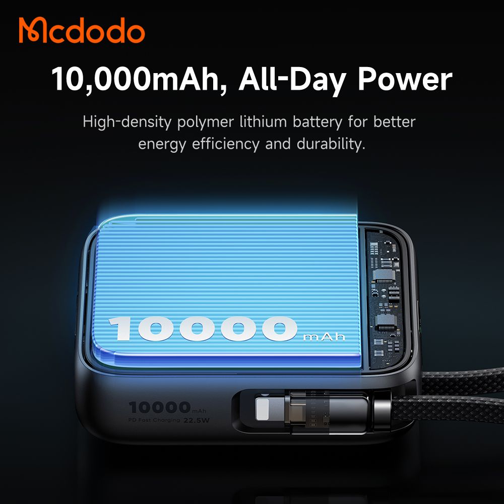ظرفیت باتری 10000 میلیآمپر ساعت ظرفیت بالای پاوربانک Mcdodo Power Bank MC-2550 امکان شارژ چندبارهی دستگاههای مختلف از جمله گوشیهای هوشمند، تبلتها و حتی ساعتهای هوشمند را فراهم میکند. این مقدار ظرفیت، کاربران را از نگرانی بابت خاموش شدن دستگاههایشان در طول روز آسوده میکند. با یک بار شارژ کامل، میتوانید دستگاه خود را تا چندین بار شارژ کنید.