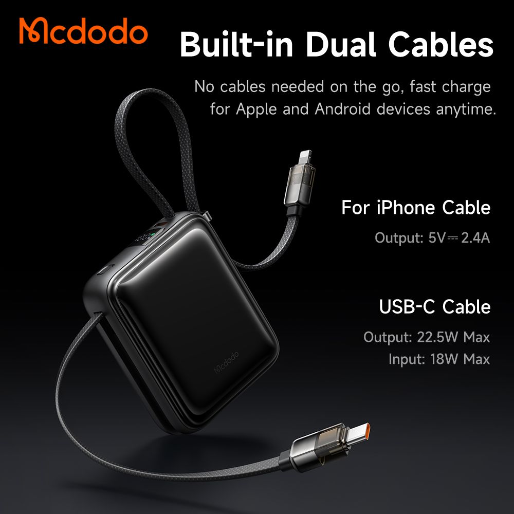 پاوربانک Mcdodo Power Bank MC-2550 دارای 2 درگاه در قسمت بالای محصول بوده که درگاه تایپ سی درگاه ورودی/خروجی پاوربانک بوده که برای شارژ پاوربانک و شارژ دستگاه های شما قابل استفاده است. به علاوه درگاه USB درگاه خروجی این پاوربانک بوده که دارای توان خروجی کلی 22.5 وات است که می توانید از طریق این پورت دستگاه های خود را با سرعت بالا شارژ کنید؛ البته باید دستگاه شما نیز از این توان پشتیبانی کند. شما به کمک این پاوربانک میتوانید با بالاترین سرعت ممکن گوشیهای آیفون خود را شارژ کنید. همانطور که اشاره شد پاوربانک Mcdodo MC2550 دارای کابل متصل است. کابل تایپ سی این پاوربانک دارای توان کلی 22.5 وات بوده که باعث شده شما بتوانید دستگاه خود را با سرعت بالا شارژ کنید.